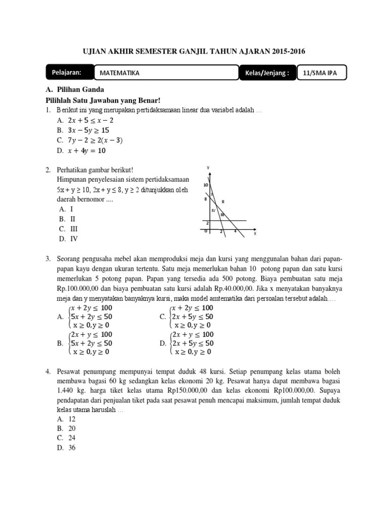 Soal pilihan ganda pertidaksamaan linear dua variabel kelas 10.